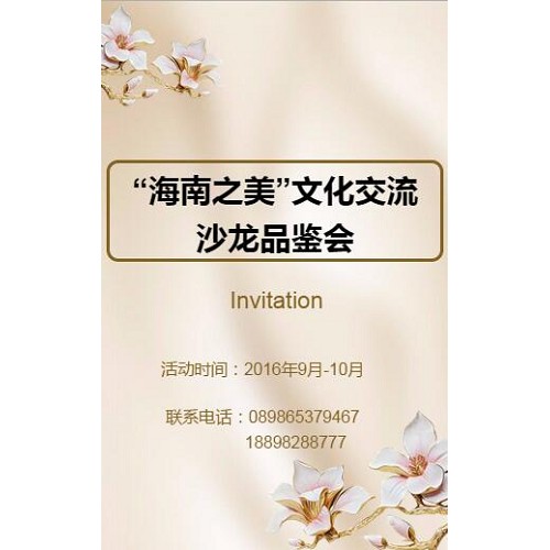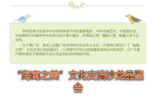 2016年9月4日,“海南之美”文化交流沙龙品鉴会在海南省油画院开幕。“海南之美”文化交流沙龙会做为弘扬海南本土字画文化的又一支有生力量,活动将在海南开展为期三周的文化交流活动,活动的主要内容有中国书画艺术名家之作的品鉴、海南传统文化的字画表演以及移动互联网时代如何在青少年中更好传承优秀中华传统文化的讲座交流活动,此次“海南之美”文化交流会是由海南民生快讯文化传媒主办,活动在省东方文化研究中心和海南省油画学会等单位的指导下开展。