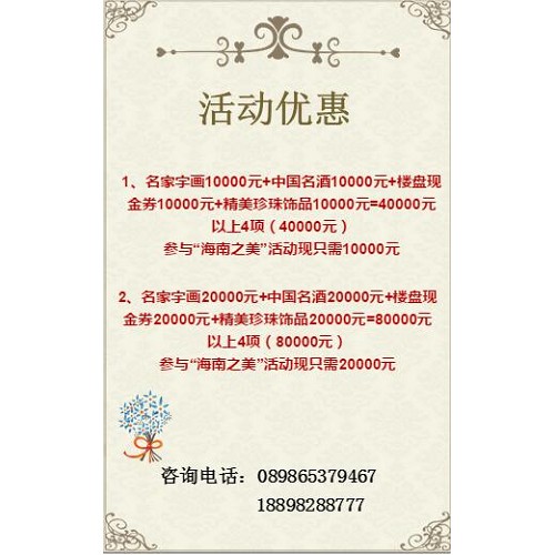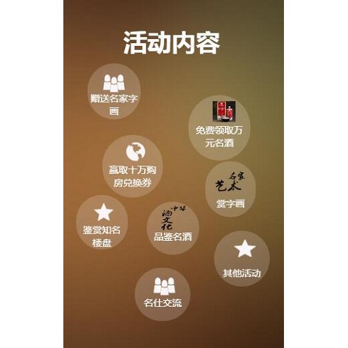 活动内容赠送名家字画、免费领取万元名酒、赢取十万购房兑换券、赏字画、鉴赏知名楼盘、品鉴名酒,其他活动和名仕交流
